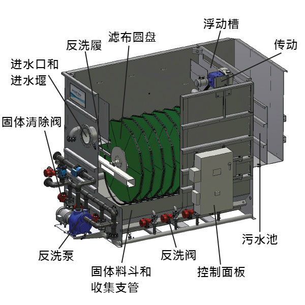 新型AquaPrime®过滤系统采用磁盘配置的OptiFiber®绒布介质,具有三个固体去除区域,可在不使用化学品的情况下有效过滤高固体废物流。